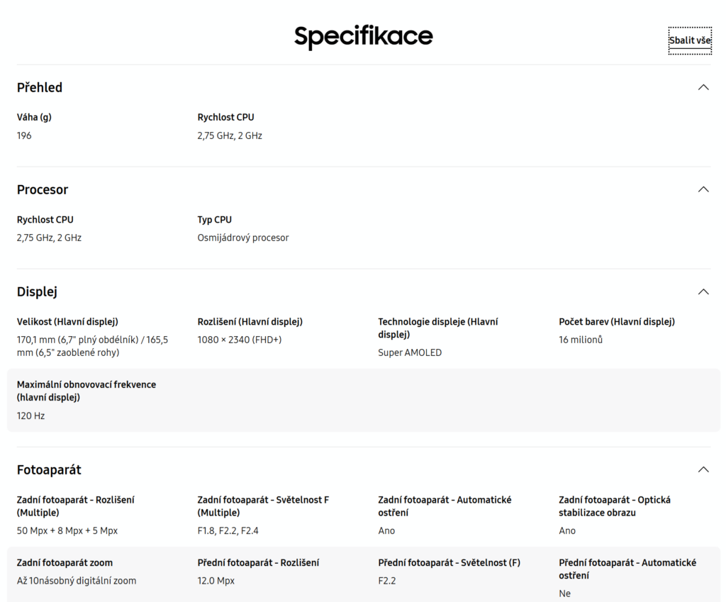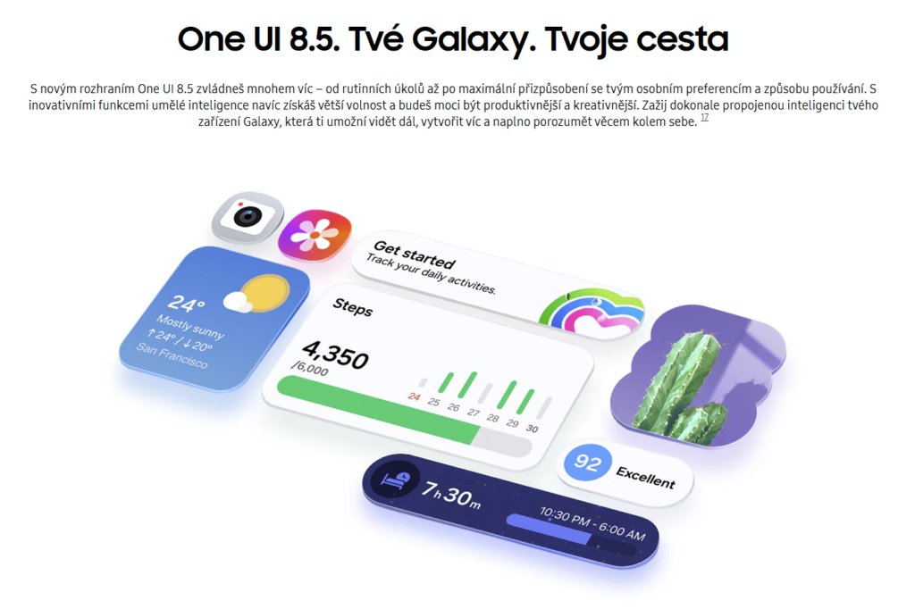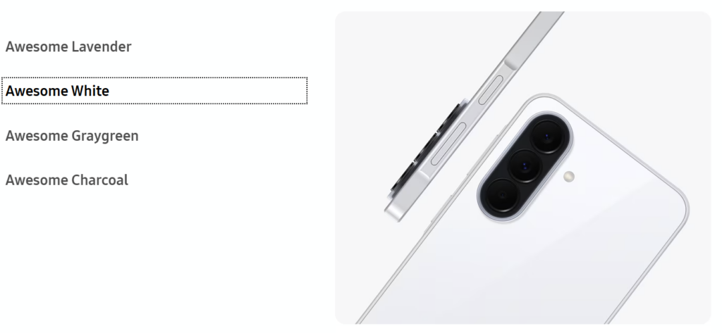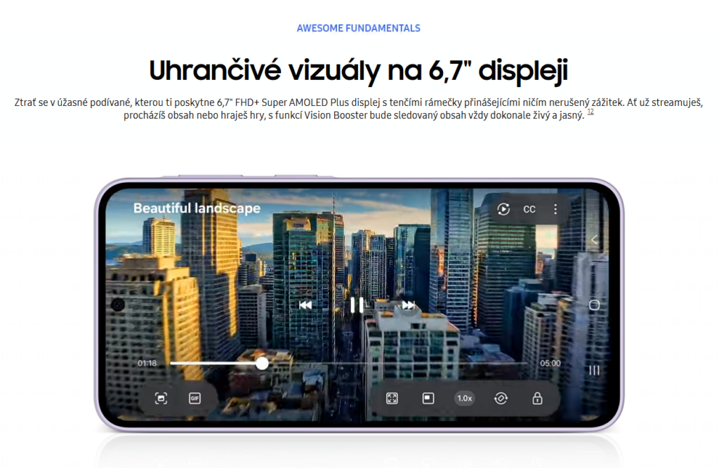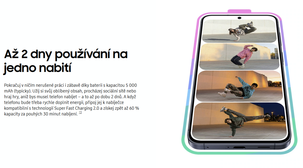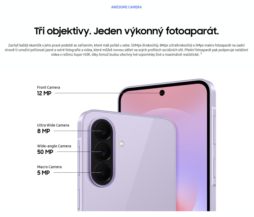 Android mobilní telefon – LCD 6,7″ AMOLED 2340 × 1080 (120Hz), úložiště: 128/256 GB, RAM: 6/8 GB, fotoaparát: 50Mpx (f/1,8) hlavní + 8Mpx širokoúhlý + 5Mpx makro + 12Mpx přední, CPU: Samsung Exynos 1480, NFC, USB-C, 5G, Dual SIM + eSIM, čtečka otisků, voděodolný dle IP68, rychlé nabíjení 45W, baterie 5000 mAh, model 2026, Android OS