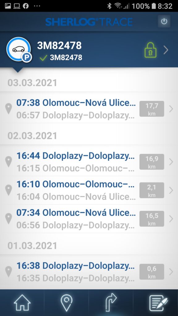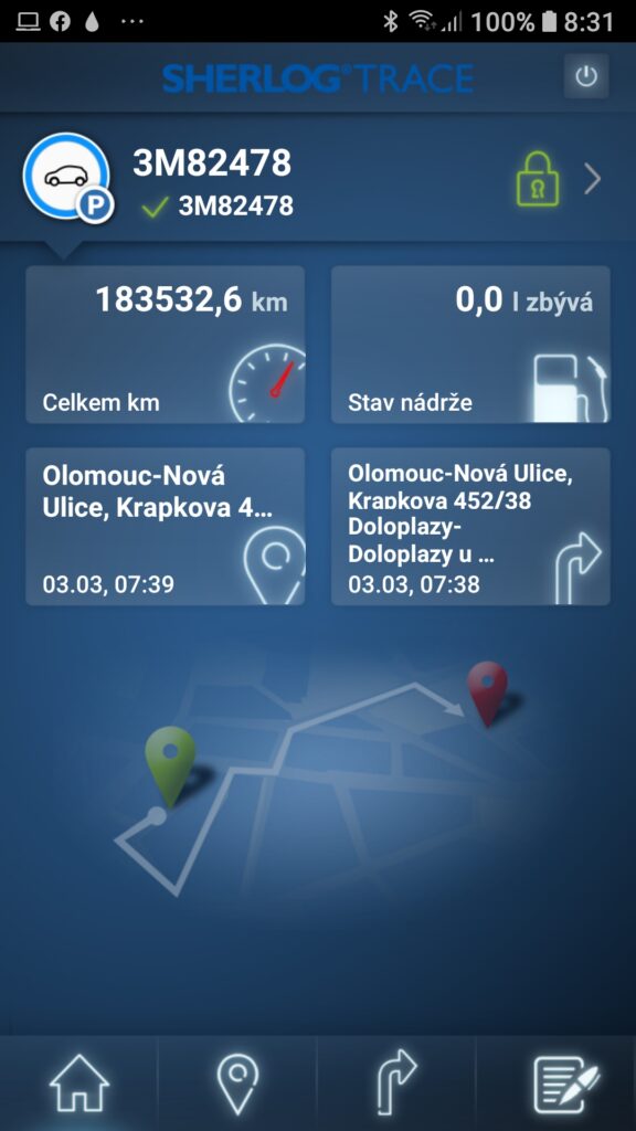 • sledování vykazovaných kilometrů – možnost změnit status jízdy na soukromou/služební